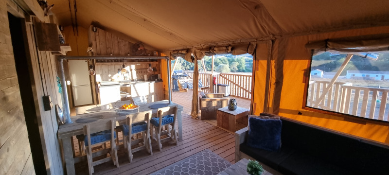 Lodgeteltene er velegnede til op til 6 personer og har 3 separate soveværelser: to med dobbeltseng og et soveværelse indrettet som hyggelig alkove med to enkeltmandssenge. Derudover finder du i lodgen et rummeligt badeværelse, der er luksuriøst indrettet med en stor brusekabine med regnbruser, en håndvask og et toilet. For ekstra komfort finder du også en føntørrer og et strygejern. Luksus Lodgen har også eget køkken, komplet med gaskomfur, stort køleskab med fryser, mikrobølgeovn, kaffemaskine og alt nødvendigt køkkenudstyr. Ved siden af køkkenet er der også en hyggelig opholdsstue med loungeområde og spisebord. Du finder også et legehjørne med legetøj til børnene. Når vejret er godt, kan du slappe af eller spise udenfor på teltets veranda. Den meget store terrasse er et af lodgens mange luksuriøse kendetegn og har en gyngestol – perfekt til afslapning. Herfra har du også adgang til din egen pool, så du kan nyde opholdet fuldt ud. Desuden er Casa da Vinha også åben i for- og eftersæsonen. Ingen anden glamping-lodge tilbyder en så stor og luksuriøs oplevelse som denne.