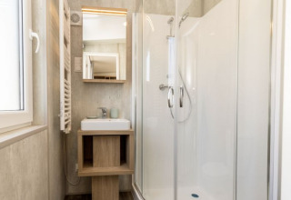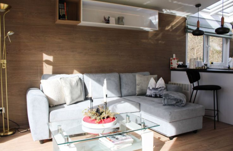 Med udsigt over bjergene byder det lidt mindre tiny house "Franzl" på i alt 26 m² boligareal. Det er indrettet med en stue med sovesofa, et veludstyret køkken, et soveværelse med boxmadras af høj kvalitet og et badeværelse. Ligesom "Seppl" har "Franzl" Wi-Fi med egen arbejdsstation, så man kan arbejde hjemmefra, og et smart-tv med streamingtjenester.