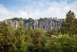 Oplev roen i et Trappeur Telt på 25 m² med en hyggelig træterrasse og et praktisk tekøkken i det fælles område. Sov komfortabelt med to dobbeltsenge og en enkeltseng, plus et badeværelse med bruser og toilet.