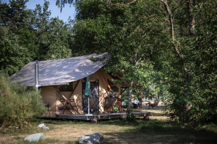 Canadienne II Teltet lader intet tilbage at ønske. Med to soveværelser bagerst har teltet plads til op til fem personer, og tekøkkenet i forenden giver dig mulighed for selv at lave mad. Den store terrasse er møbleret med både havemøbler og bistrobord.
