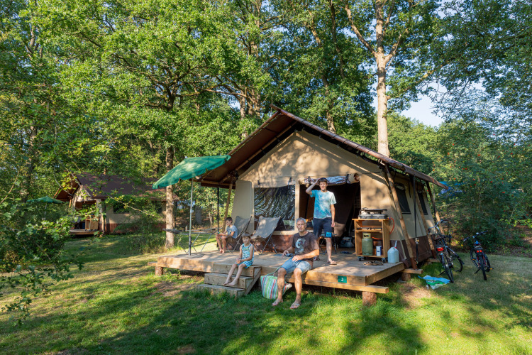 Dette telt med to soveområder til i alt fem personer er fuldt udstyret: et tekøkken (med køleskab, komfur og komplet køkkenudstyr), en spiseplads og et dejligt badeværelse. Den store træterrasse udenfor har havemøbler.