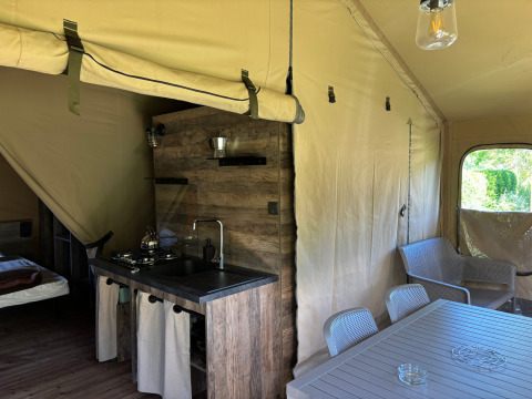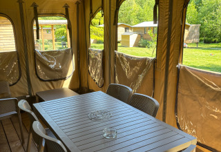 Oplev et charmerende glampingsted med to separate soveværelser, ideelt til et afslappende ophold. Tilbered måltider i det fuldt udstyrede køkken, og nyd de moderne sanitære faciliteter. Slap af på terrassen med komfortable liggestole og et havesæt, der er perfekt til en solrig eftermiddag eller en grillaften. Indvendigt er der et hyggeligt opholdsrum med effektiv opvarmning og moderne multimedieudstyr. Kæledyr er ikke tilladt, hvilket sikrer fred og ro. Ideelt til dem, der ønsker at kombinere privatliv, komfort og udendørsliv med en praktisk indretning og alle vigtige faciliteter inden for rækkevidde. En perfekt blanding af komfort og natur, klar til et ubekymret ophold.