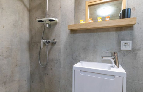 I den lyse stue indbyder en behagelig lænestol og sofa til afslapning. Fjernsynet sørger for underholdning, mens du slapper af. Det moderne tekøkken med Nespresso-maskine og spiseplads er ideelt til at tilberede lette måltider. Aircondition og gulvvarme sikrer en behagelig atmosfære hele året rundt. Det separate soveværelse har en højkvalitets boxmadras med gennemgående madras (160 cm bred). Din søvn er garanteret. Det moderne badeværelse er udstyret med en brusekabine, toilet og håndvask. Lyse fliser, et gennemtænkt layout og naturlige materialer skaber en indbydende atmosfære. På den private solterrasse kan du nyde udsigten over de omkringliggende grønne områder, slappe af i loungesofaerne eller grille på den elektriske grill ved solnedgang. Den store have med bålplads deles med gæsterne i Waldblick- og Bergblick-lejlighederne.