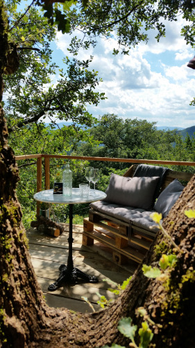 Træhytten i Toscana kaldes TreeHugger, fordi den faktisk omslutter det 200 år gamle egetræ. Dette specielle soveværelse er ideelt til eventyrlystne, der i hemmelighed nyder et strejf af luksus. Fra alle sider har du en fantastisk udsigt over dalen og landsbyens ruiner. Soveværelset har en komfortabel dobbeltseng, og hvis du går en lille smule op ad bjerget, finder du et udendørs badeværelse med bruser og toilet. Selv mens du bader, kan du nyde den vidunderlige udsigt. Træhytten har elektricitet og giver følelsen af at have hele landsbyen for dig selv – helt afsondret, men kun få minutters gang fra poolen.