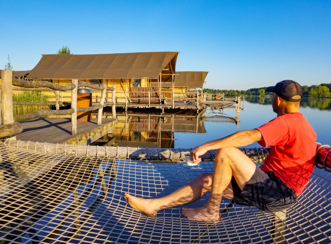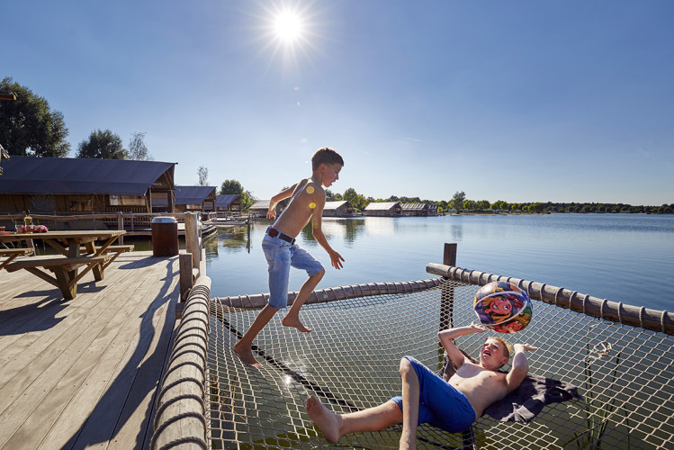Bo i en af WaterLodges lige over vandet. Ikke søstærk? Ikke noget problem! På et fast plateau over vandet står en superluksuriøs WaterLodge til 8 personer. Slap af i dit hængenet over vandet med udsigt over rekreationssøen og vågn op i en rigtig himmelseng eller alkoveseng – det er camping... men alligevel anderledes! Alt er til stede i disse hytter på to etager. En komfortabel opholdsstue, legerum til børnene, eget badeværelse med bruser, et separat toilet og et fuldt udstyret køkken med opvaskemaskine og en Nespresso-maskine for en god kop kaffe om morgenen. På den private træterrasse er der udover et picnictable også en loungesofta til afslapning.