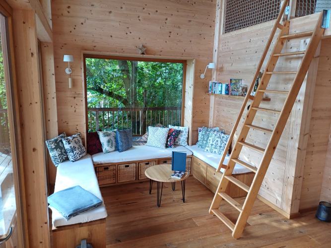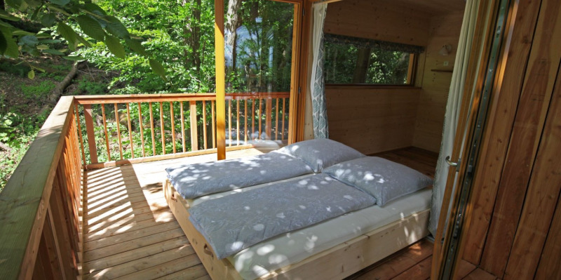 En overdækket balkon, der går hele vejen rundt om træhuset med rustikke siddepladser, liggestole og hængestole inviterer til afslapning. Udstyret inkluderer også spil, bøger og kort til udflugter. Alt tekstil er lavet af økologisk bomuld. Træhuset kombinerer natur, design og luksus – ideelt til et afslappende ophold midt i naturen.