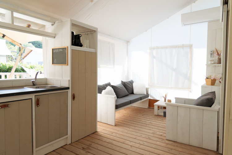 Der er to typer lodge-telte hos Villa Alwin Beach Resort: et 5-personers og et 7-personers telt. Indretningen og dekorationen i teltene giver dig straks følelsen af luksusferie, men stadig med den afslappede campingstemning – eller rettere, glamping. Her finder du blandt andet et flot badeværelse med bruser og toilet, et fuldt udstyret køkken med service og opvaskemaskine, hyggelig opholdsstue med spisebord samt en stor veranda. Der er en stor dobbeltseng og køjesenge til børnene. DIAMOND og GOLD-udgaverne har endda eget spabad. Myggenet beskytter dig mod myg, og aircondition holder dig kølig. Vidunderlig glamping i Le Marche!