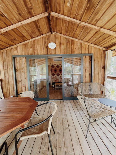 Den særlige Cabane Bobo & Spa er en hyggelig lodge, der er velegnet til 5 personer. Lodgen har et soveværelse med en dobbeltseng og et andet med 2 enkeltsenge samt en hængekøje til børn under 11 år. Det fuldt udstyrede køkken, med vintage apparater som opvaskemaskine, mikrobølgeovn og espressomaskine, gør det nemt at være selvforsynende. Badeværelset udstråler luksus med en rummelig bruser, håndvask og opvarmet håndklædetørrer, mens toilettet er separat. Der er også aircondition i lodgen.