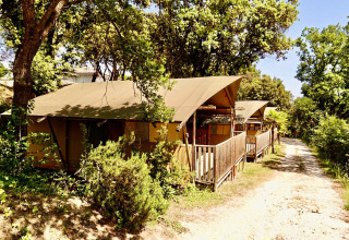 Safariteltet med eget badeværelse er 38 m² og har plads til 4 personer. Der er 2 boxspring-senge (80x200) med myggenet og et separat børneområde med køjesenge (80/90x200) og myggenet. Sengene er redt ved ankomst. Køkkenet er fuldt udstyret med gaskomfur med 4 blus (eller elektrisk, afhængigt af beliggenhed), køle-fryseskab og rindende varmt og koldt vand. Der er en spiseplads indenfor, og udenfor er der 2 liggestole på den rummelige veranda. Teltet har elektricitet og et inventar, der passer til 6 personer. Hvis det er nødvendigt, kan der placeres et ekstra telt ved siden af teltet (med undtagelse af visse steder). Verandaen byder på masser af plads til udendørs ophold, spisning og afslapning.