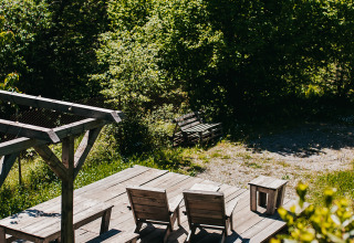 Safariteltet ligger centralt på campingpladsen og har en rummelig, privat plads omgivet af træer. Her kan du nyde skyggen og de naturlige omgivelser i fred og ro - ideelt til en familieferie. Teltet er fuldt udstyret med et fuldt udstyret køkken med køkkenredskaber, et gaskomfur med fire blus, en vask med rindende vand, et køleskab, en kaffemaskine og en kedel. I stuen er der et spisebord, som er perfekt til hyggelige måltider. Safariteltet har to sovekabiner: en med en dobbeltseng (140x200 cm) og en med to køjesenge. Derudover er der et privat badeværelse med toilet, håndvask og bruser. Alle senge er udstyret med tæpper og puder. I 2025 vil alle telte være udstyret med komfortable træmøbler.