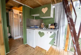 Stueetagen har et fuldt udstyret køkken—komplet med en Nespresso-maskine—og et privat badeværelse med bruser. Udenfor inviterer en rummelig, møbleret terrasse dig til at slappe af i naturen. Selvom denne autentiske oplevelse ikke inkluderer aircondition eller opvarmning, kan du nyde luksussen af friske håndklæder og opredte senge ved ankomst. (Bemærk venligst: kæledyr er ikke tilladt).