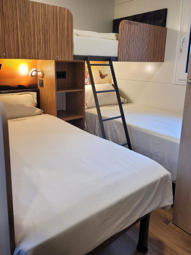 Indretning: et soveværelse med en dobbeltseng (1,60 x 2,00), et soveværelse med to enkeltsenge (0,80 x 2,00 og 0,80 x 1,60) og en ekstra høj (køjeseng) (0,80 x 2,00), der nås via en trappe (seng egnet til op til 80 kg). Denne bolig har ikke mindre end to badeværelser med håndvask og bruser samt et separat toilet. Naturligvis er der en stue og et køkken med alle moderne bekvemmeligheder, inklusive et bluetooth-lydsystem.