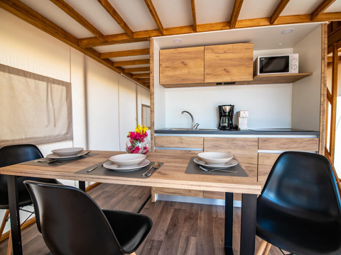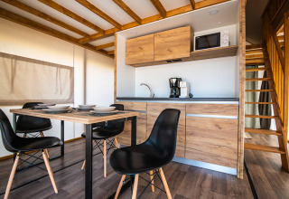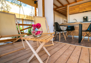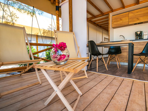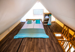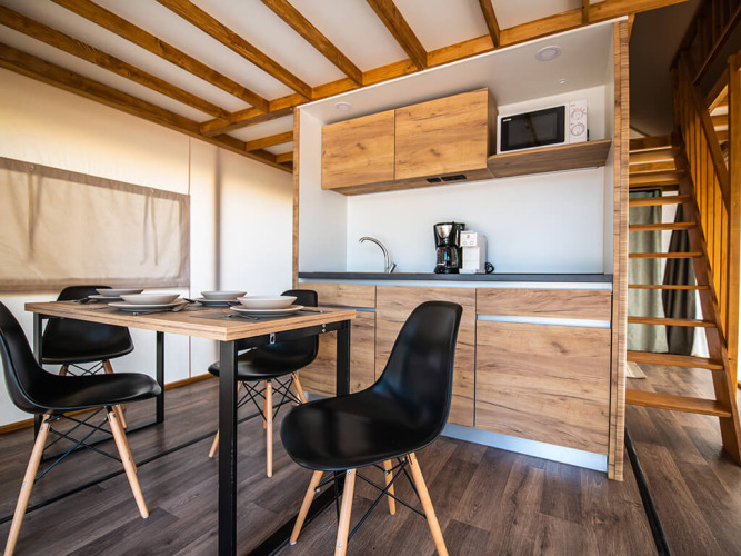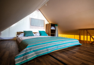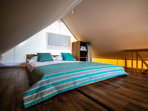 Premium Two Bedroom Safari Loft Tent (2+2) tilbyder et komfortabelt og veludstyret ophold tæt på stranden. Med sine 42 m² er der plads til op til fire gæster, og der er aircondition samt gratis Wi-Fi. Det fuldt udstyrede tekøkken har induktionskogeplade, mikrobølgeovn, køleskab, kaffemaskine, elkedel og en ILLY espressomaskine. Stueetagen rummer et soveværelse med en dobbeltseng (160x200 cm), mens galleriet har et andet soveværelse med en dobbeltseng (160x200 cm) og en privat terrasse. Badeværelset har bruser, hårtørrer og badeartikler. Yderligere faciliteter inkluderer LCD fladskærms-tv med IPTV, personlig bærbar computersafe og parkering. Sengelinned, håndklæder og slutrengøring er inkluderet, med friskt sengetøj hver tredje dag og rene håndklæder hver anden dag. Kæledyr er velkomne mod et ekstra gebyr.