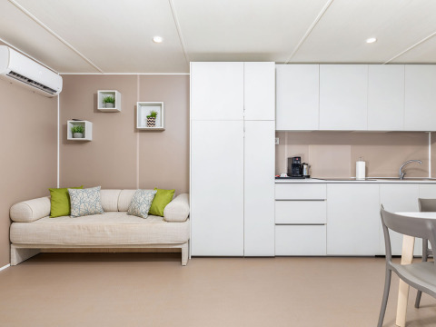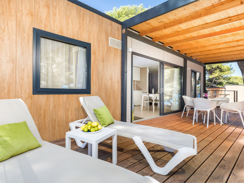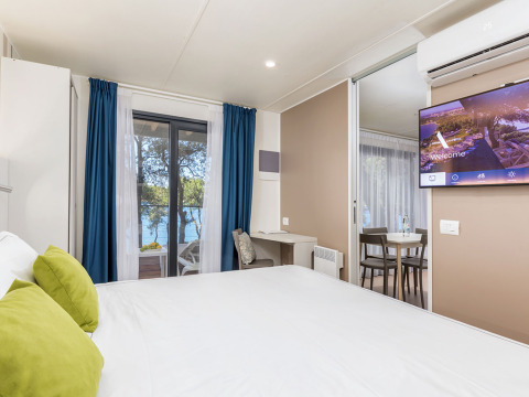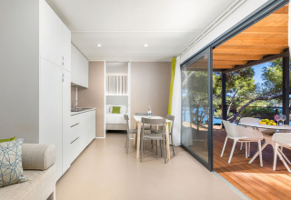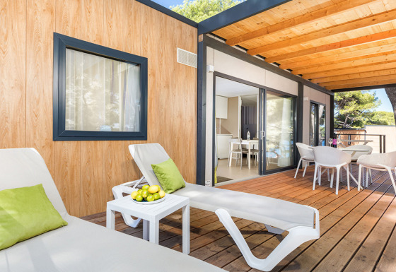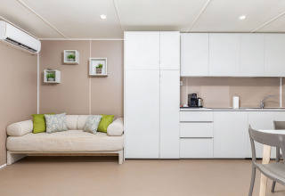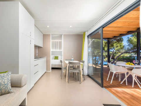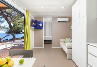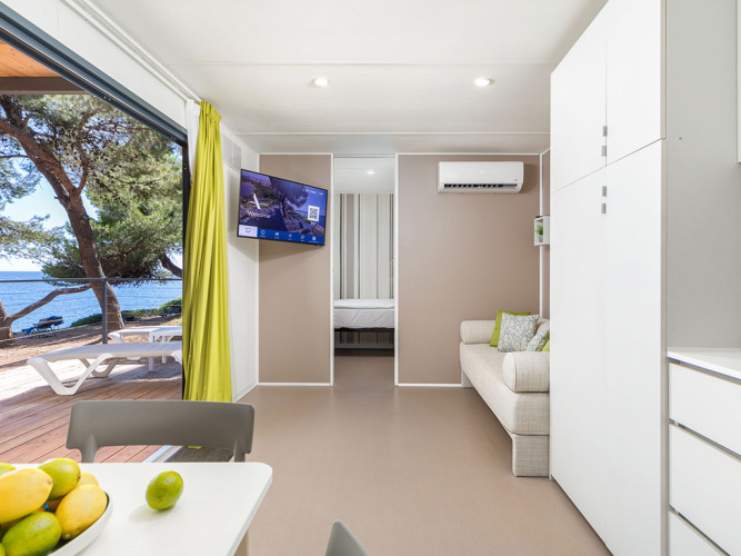 Camping Villa Sea View er en 46 m² bolig med en ekstra 29 m² terrasse, designet til op til 6 gæster, og byder på havudsigt. Den har aircondition og gratis Wi-Fi. Opholdsstuen indeholder en sovesofa (80x185 cm) og et fuldt udstyret tekøkken med stort køleskab med fryser, opvaskemaskine, induktionskogeplade, mikroovn, elkedel og en ILLY espressomaskine.