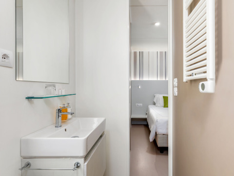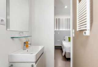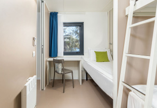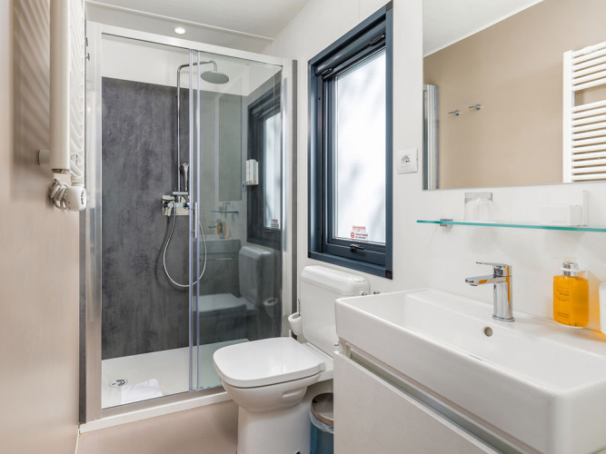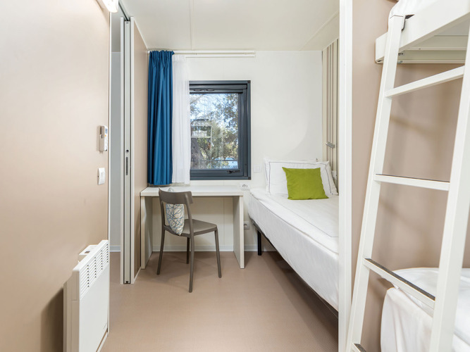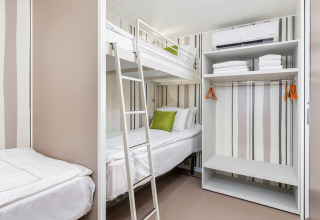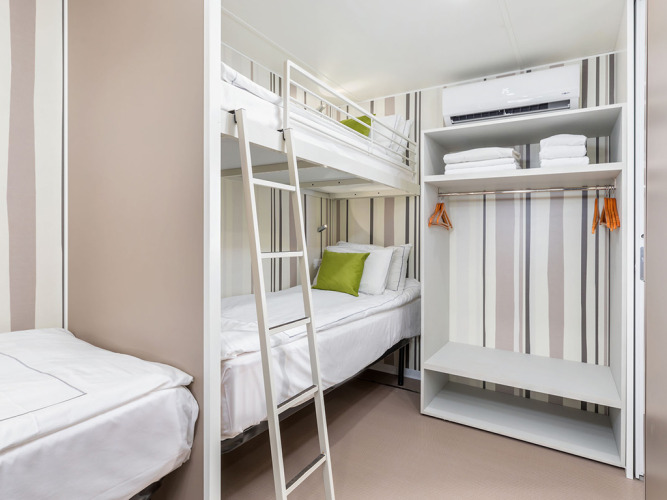 Soveværelset har en dobbeltseng (180x200 cm) og et privat badeværelse med bruser, hårtørrer og toiletartikler. Det andet soveværelse har en køjeseng og en hemseseng (alle 80x200 cm) med eget badeværelse. Der er installeret to 43-tommer smart-tv (et i soveværelset, et i opholdsstuen), begge IPTV-klar.