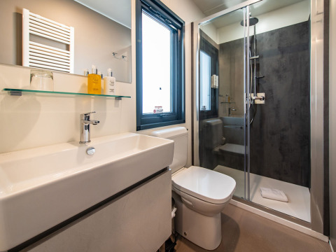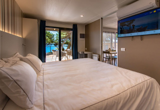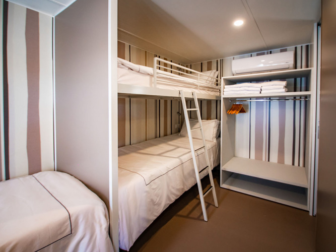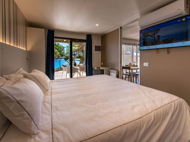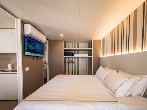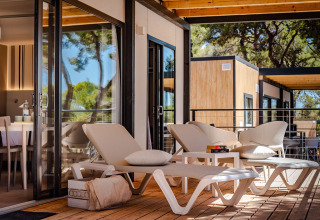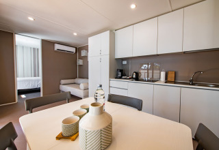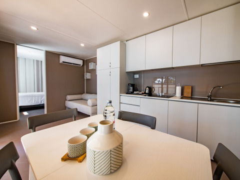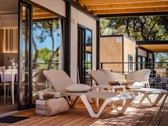 Camping Villa er en 46 m² bolig med en ekstra 29 m² terrasse, designet til op til 6 gæster. Den har aircondition og gratis Wi-Fi. Opholdsområdet inkluderer en sovesofa (80x185 cm) og et fuldt udstyret tekøkken med stort køleskab med fryser, opvaskemaskine, induktionskogeplade, mikrobølgeovn, elkedel og en ILLY espressomaskine.