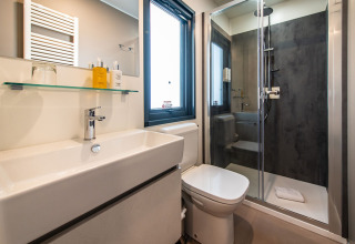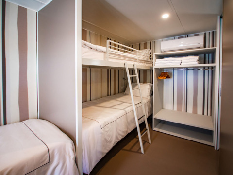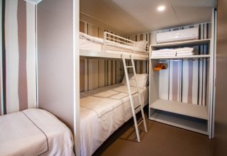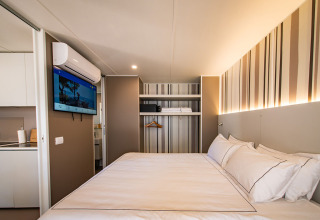 Soveværelset har en dobbeltseng (180x200 cm) og et eget badeværelse med bruser, hårtørrer og toiletartikler. Det andet soveværelse inkluderer en køjeseng og hemseseng (alle 80x200 cm) med eget badeværelse. To 43-tommers smart-TV'er er installeret (et i soveværelset, et i opholdsområdet), begge klar til IPTV.