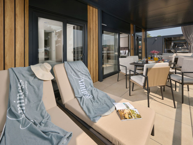 Amber Luxury Holiday Home tilbyder 41 m² komfortabelt boligareal, beliggende i anden række fra havet. Den har to soveværelser, et med dobbeltseng og et andet med to enkeltsenge, samt to private badeværelser med brusere. Den lyse stue rummer et fuldt udstyret køkken med kaffemaskine, elkedel, mikrobølgeovn, køleskab og opvaskemaskine. En 27 m² stor terrasse udvider opholdsarealet og er møbleret med spisebord, seks stole, to solsenge og udendørs siddepladser. Faciliteterne inkluderer aircondition, satellit-tv, Wi-Fi, værdiboks, toiletartikler, sengelinned, håndklæder og hårtørrer. Indkvarteringen tilbyder også parkering, er kæledyrsvenlig, røgfri og har mulighed for ekstra seng eller barneseng.