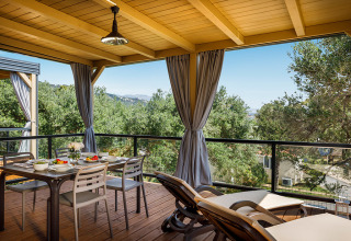 Træd ud på din store overdækkede terrasse—en af glampingboligens fremtrædende faciliteter. Terrassen er møbleret med et udendørs spisebord, stole og et hyggeligt loungeshjørne, hvilket gør det til det perfekte sted at slappe af med en kop kaffe eller nyde måltider. Liggestole indbyder til at nyde den omkringliggende ro.