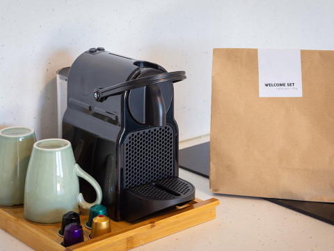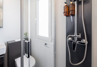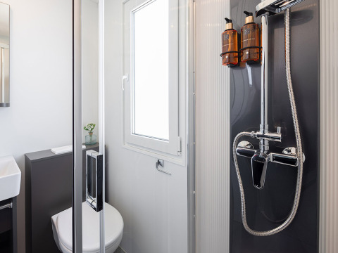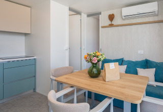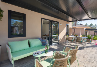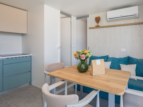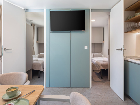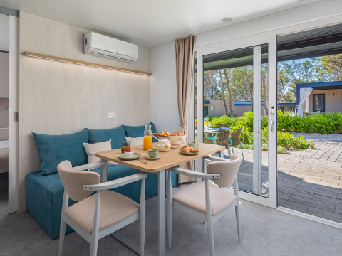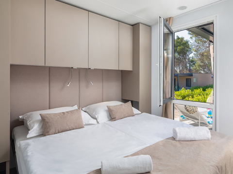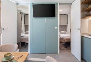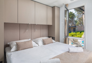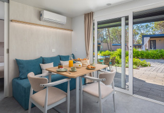 Family Premium Holiday Home er en rummelig bolig på 33 m², designet til op til seks voksne og ét barn. Den har tre soveværelser: ét med dobbeltseng og to med enkeltsenge. Boligen har også to badeværelser, som begge er udstyret med bruser. Opholdsstuen indeholder et fuldt udstyret køkken med opvaskemaskine, Nespresso- og filterkaffemaskiner samt elkedel. Træd ud på den private terrasse, som er møbleret med et bord, seks stole, to liggestole og en parasol – perfekt til afslapning i solen (eller skyggen). Aircondition sikrer komfort under hele opholdet.