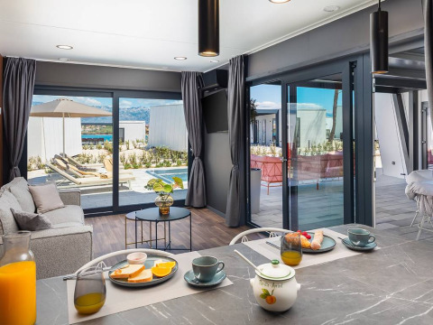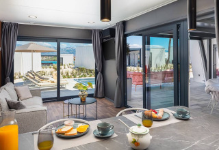Luxury Glamping Villa Pool er en rummelig villa på 70 m², ideel til familier eller små grupper, beliggende i 2. og 3. række til havet. Villaen er designet til at rumme op til 5 voksne eller 4 voksne og 2 børn, og har to komfortable soveværelser med dobbeltsenge samt to badeværelser med brusere og toiletter. Opholdsområdet inkluderer et fuldt udstyret køkken med opvaskemaskine, Nespresso- og filterkaffemaskine samt elkedel, som giver alt, der er nødvendigt for et ophold med selvforplejning.