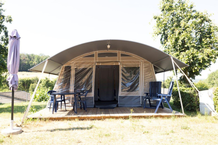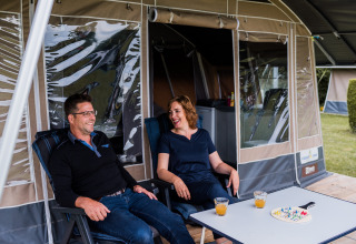 Teltet har fem sovepladser fordelt på tre separate sovekabiner. I forældrekabinen står der endda to komfortable boksmadrasser. Under det rummelige halvtag er der masser af plads til at slappe af. Du skal kun tage din personlige bagage og køkken- og badehåndklæder med. Resten er allerede til stede for en afslappende ferie.