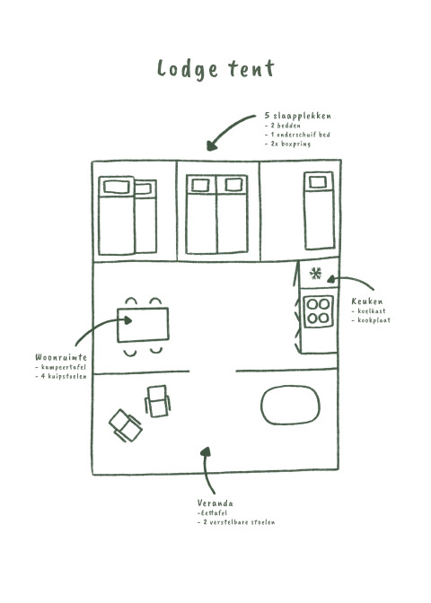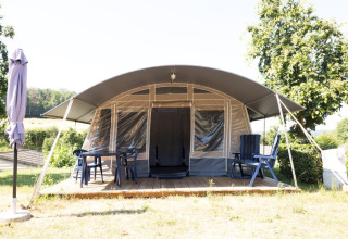 I dette rummelige tunneltelt har du al den plads, du har brug for, og du oplever den ægte campingfølelse. Den optrækkelige frontvæg gør, at inde og ude smelter sømløst sammen, hvilket giver en skøn, åben fornemmelse. Teltet er fuldt udstyret med et komplet basissæt, herunder et køleskab, komfur og faste senge. Ideelt for dem, der ønsker at opleve den ægte camping, men med et strejf af komfort – præcis det du finder i Lodge.