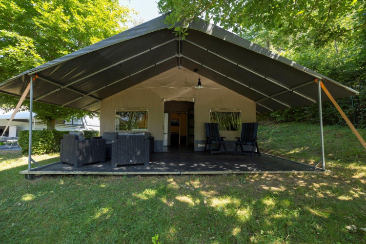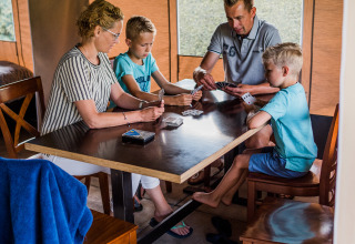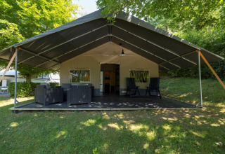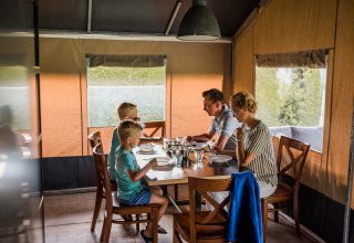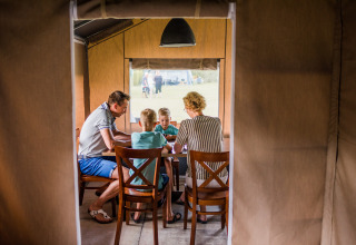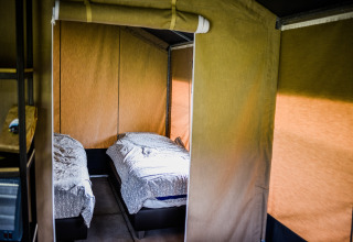 Safaritent Lodge de Luxe giver den ultimative følelse af camping med komforten fra et eget feriehus. Dette telt ser måske beskedent ud udefra, men overrasker med masser af plads: 8,40 meter langt og 6 meter bredt, inklusive et rummeligt overdække. Takket være den luksuriøse indretning bliver opholdet i dette glampingtelt ekstra komfortabelt.