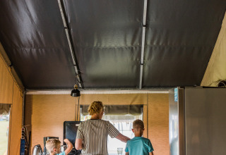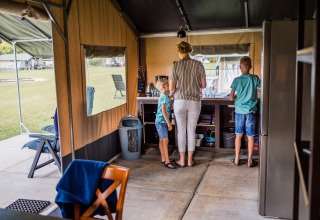 Køkkenet har koldt rindende vand og et stort køle/fryseskab, så I nemt kan lave mad selv. Udenfor står der et komfortabelt loungesæt under overdækket, hvor det er skønt at slappe af. For jer, der elsker campinglivet, men ikke vil gå på kompromis med bekvemmelighed og komfort, er denne Safaritent et fremragende valg.