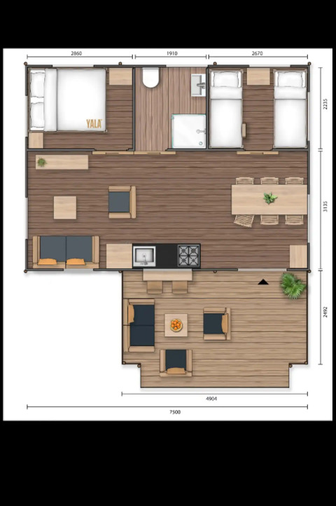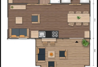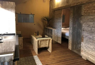 Oplev det ultimative familieeventyr i vores Luxury Safari Lodge, hvor camping møder ren komfort. Dette rummelige tilflugtssted på 55 m² tilbyder alt, hvad du behøver for en bekymringsfri ferie. Træd indenfor og find et generøst opholdsområde med lounge og spiseplads samt et fuldt udstyret køkken med fireblus komfur, mikrobølgeovn og stort køleskab – perfekt til hjemmelavede måltider.