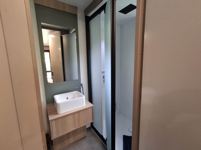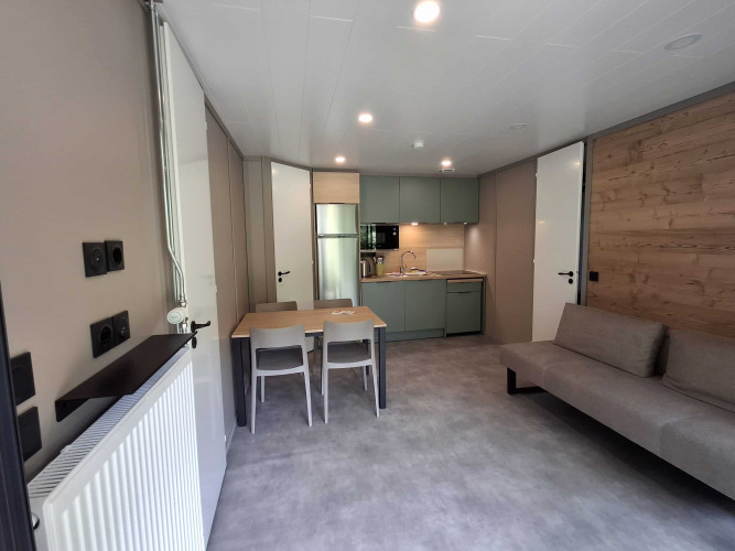 Dette moderne chalet-hotel tilbyder et komfortabelt ophold i rolige og naturskønne omgivelser. Indenfor finder du et lyst opholdsrum med siddeområde og et åbent køkken, udstyret med induktionskogeplade, opvaskemaskine, køleskab og fryser, elkedel og mikrobølgeovn. Indkvarteringen har to soveværelser, hver med eget badeværelse med bruser og håndvask samt et separat toilet, hvilket giver ekstra privatliv og bekvemmelighed under dit ophold.