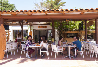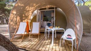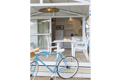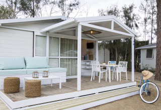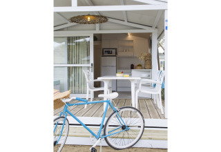 Chaletet har et moderne badeværelse med bruser og toilet, så du ikke behøver at dele faciliteter med andre. Udenfor kan du nyde din egen overdækkede terrasse eller veranda – det ideelle sted til lange sommeraftener, en afslappet morgenmad eller et stille øjeblik med en bog. Det er et komfortabelt udendørs opholdsrum, hvor du virkelig kan nyde feriestemningen.