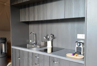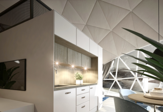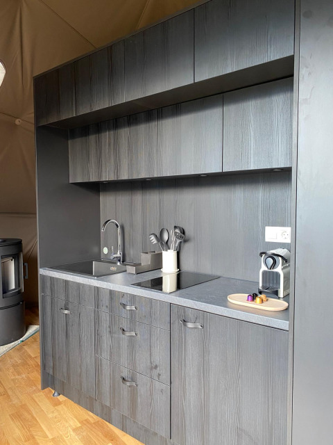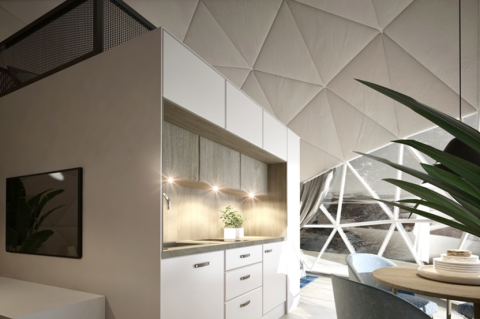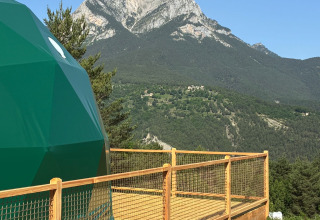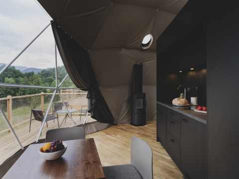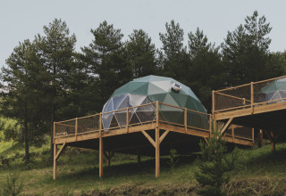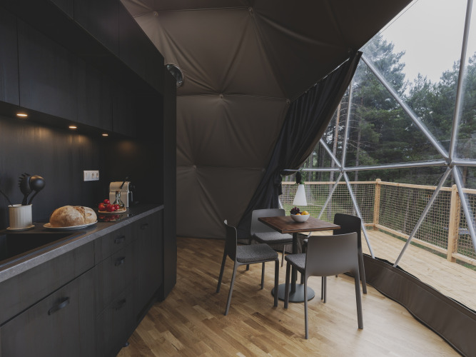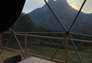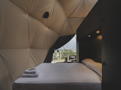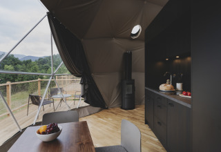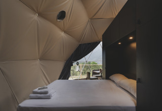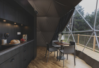 Dôme er designet til at tilbyde et rummeligt og åbent område med en mezzanineseng og en dobbeltseng. Det er det ideelle sted for en unik oplevelse. Takket være den kuppelformede arkitektur kan du nyde en enestående udsigt over en stjernehimmel. Derudover forlænger terrassen, med sine alsidige og praktiske møbler, opholdsområdet, så du føler dig fuldstændig forbundet med naturen.