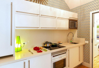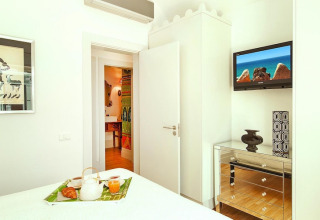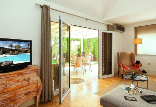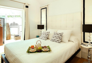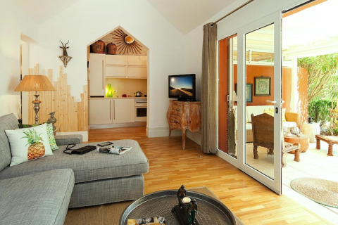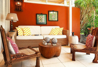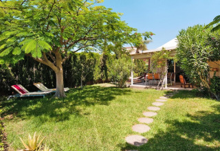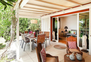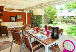 Udenfor har du din egen lille have og en overdækket terrasse med komfortable rattansæder. Det er et indbydende sted at starte morgenen med en kop kaffe, læse en bog i skyggen eller afslutte dagen med en drink og lange, hyggelige samtaler. Atmosfæren er privat og afslappet, men du er stadig tæt på alt, hvad du får brug for.