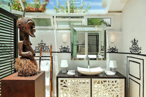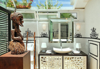 Indenfor føles bungalowen varm og speciel takket være dens originale og kvalitetsbevidste indretning. Omhyggeligt udvalgte træmøbler kombineres med afrikanskinspirerede detaljer og smagfulde vægdekorationer, hvilket skaber en stilfuld men hjemlig ramme. Med to soveværelser og to badeværelser er der plads nok til op til fire personer, hvilket gør det til et godt valg for par, der rejser sammen, venner eller en lille familie.