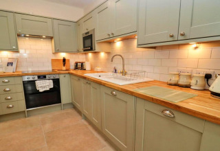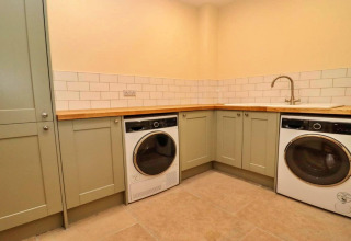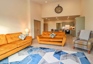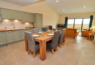 Hjertet i laden er det lyse, åbne opholdsrum. Sæt dig til rette i de komfortable sofaer, stream dine yndlingsserier på smart-tv'et, og slå de store foldedøre op til den private have, når solen kigger frem. Det fuldt udstyrede køkken har alt, hvad du behøver til nemme selvforplejningsaftener: elektrisk ovn og kogeplader, mikrobølgeovn, køleskab, fryser og en praktisk opvaskemaskine, så ingen skal stå for opvasken. Der er endda et separat bryggers med vaskemaskine og tørretumbler – ideelt hvis du bliver lidt længere.