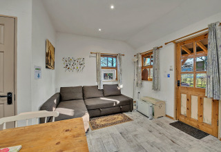 Når du træder ind, finder du et lyst og indbydende rum med en behagelig sovesofa, der er redt op med frisk sengetøj og bløde håndklæder til dit ophold. Loungeområdet er ideelt til dovne morgener og afslappede aftener, med digitalt TV, Wi-Fi og et lille spisebord, hvor I kan nyde morgenmad, spille spil eller planlægge dagens eventyr.