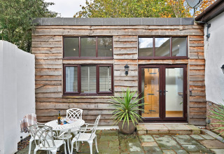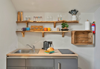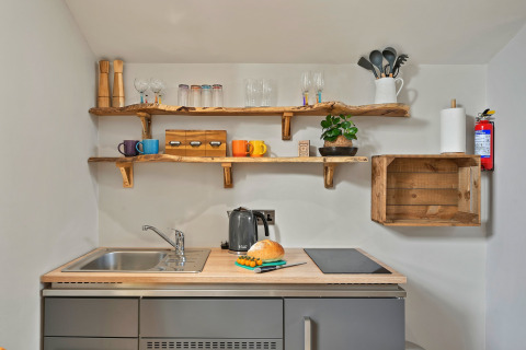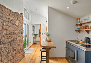Inde finder I et varmt og indbydende rum med mange gennemtænkte detaljer. Opholdsstuen er åben og har et veludstyret køkkenniche, så I let kan lave simple morgenmader eller en særlig middag for to. Nyd måltidet ved den rustikke morgenmadsbar i eg, eller skub døren til side og gå ud på den indhegnede bagterrasse for en drink under åben himmel.