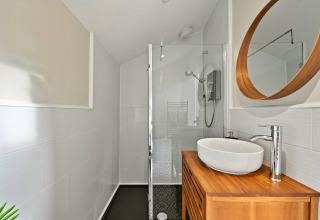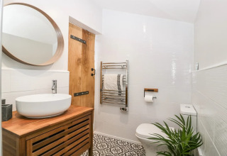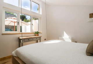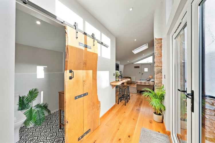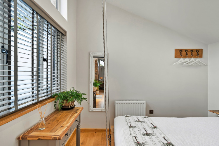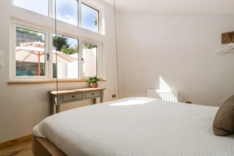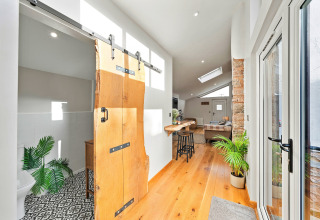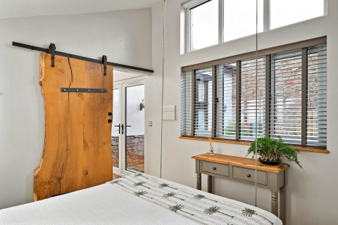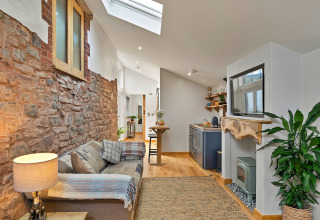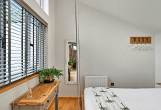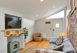 Efter en dag med udforskning af Devons landskab kan I slappe af på den komfortable sofa foran elpejsen og sætte jeres yndlingsfilm på. En smukt håndlavet skydedør adskiller det hyggelige soveværelse fra opholdsområdet, hvilket giver jer privatliv og en lun, indhyllet stemning.