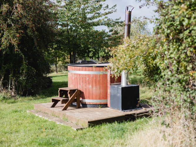 Dit brændefyrede spabad er eksklusivt til brug under dit ophold og er placeret ved siden af eller i nærheden af dit skjulested i lærred. Perfekt til afslapning under stjernerne eller i løbet af dagen.
