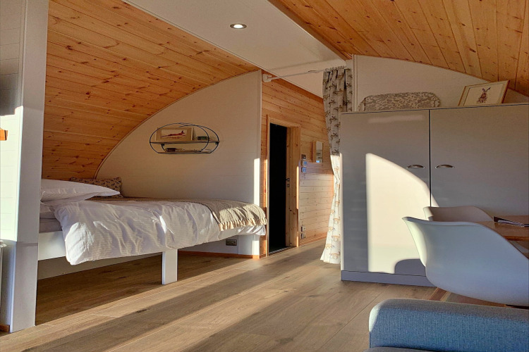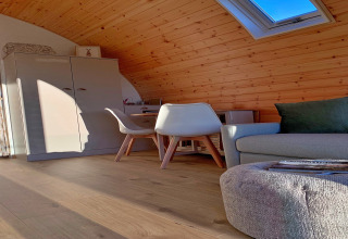 Det tilstødende brusebadeværelse betyder, at du slipper for sene gåture over marken – du træder bare direkte ind i dit eget private badeværelse. Udenfor er der et siddeområde, det perfekte sted til en aften drink under stjernerne. Tænd bålfadet for ekstra varme og stemning, eller lej en gasgrill og lav mad ude i det fri.