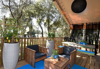 • Luftaufnahme des Campingplatzes Arena Stoja in Istrien, Kroatien mit klarem Wasser, Booten und Küste.