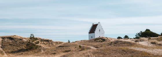 • Menschen wandern einen grünen Hügel zum Strand bei Hvalpsund Familie Camping in Nordjütland, Dänemark, hinab.