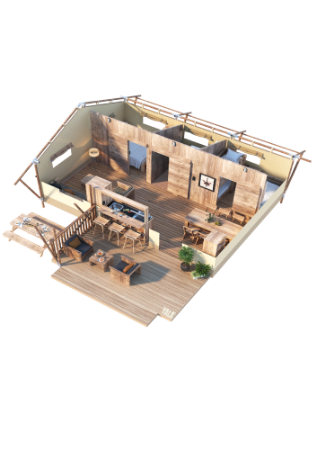 Das Zelt hat zwei Schlafabteile: ein Hauptschlafzimmer mit einem Doppelbett und ein zweites Schlafzimmer mit zwei Einzelbetten und einem Etagenbett für ein Kind (max. 30 kg). Die Betten sind mit Bettdecken, Kissen und Bettwäsche ausgestattet.