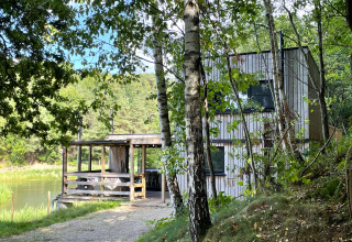 Jede Hütte ist mit einer überdachten Terrasse und einem Gasgrill ausgestattet. Setzen Sie sich gemütlich an den großen Tisch im Freien unter der stimmungsvollen Beleuchtung und genießen Sie die schöne Natur.