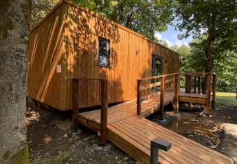 • Eine Holzhütte im Ferienpark Hameau de l'Ourthe in Belgien-Luxemburg, umgeben von grüner Natur.