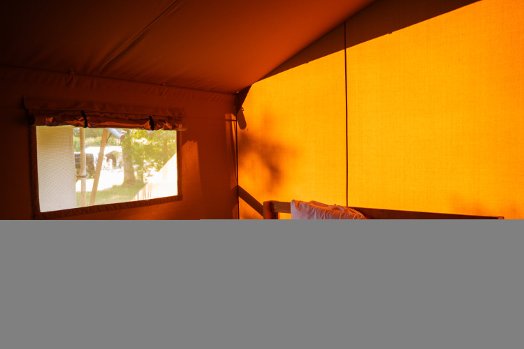 Im hinteren Teil des Zeltes befinden sich zwei Schlafkabinen. In einer Schlafkabine steht ein Doppelbett, in der anderen Schlafkabine stehen zwei Etagenbetten.