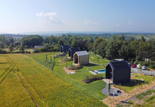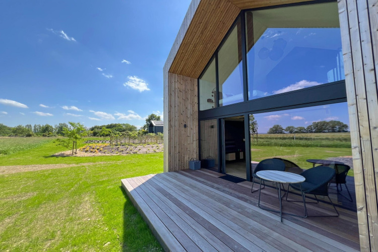 Der Garten rund um die Lodge wird mit drei weiteren Lodges geteilt, aber es gibt genügend Platz und Ruhe für alle. Sie haben außerdem Zugang zu einem gemeinschaftlichen Schwimmbad – ideal für eine erfrischende Abkühlung nach einer Wanderung oder Radtour.