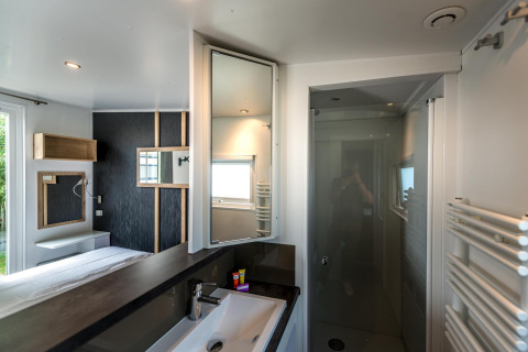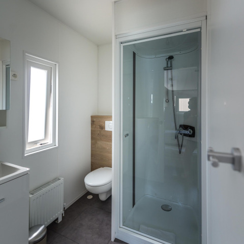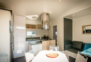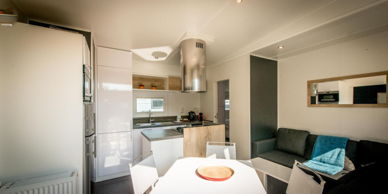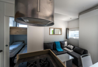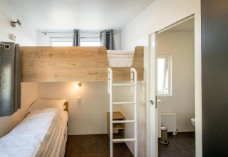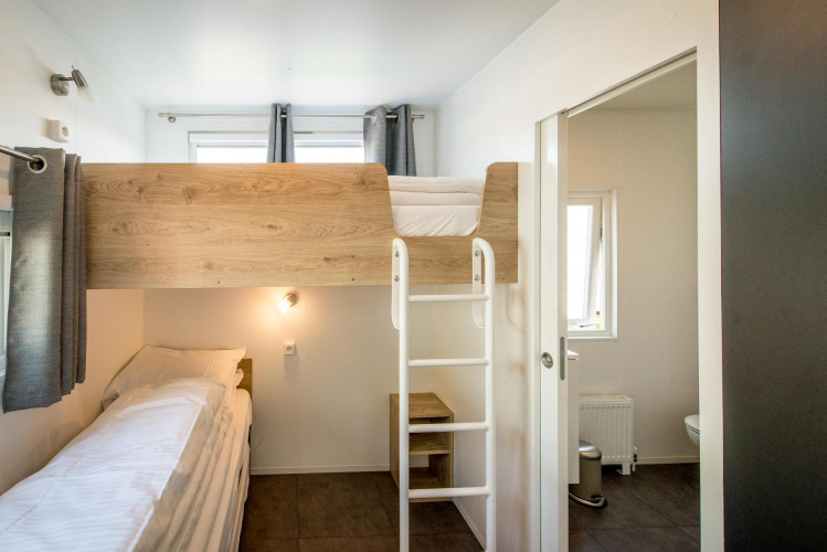 Dieser Bungalow L verfügt über ein Hauptschlafzimmer mit Doppelbett (160 x 200), ein integriertes Badezimmer mit großer Dusche, Waschbecken, Haartrockner, Handtüchern und Pflegeprodukten. Ein zweites Schlafzimmer mit 3 Einzelbetten (1 Hochbett, die 2 unteren Betten können als Doppelbett genutzt werden) mit angrenzendem Badezimmer mit Dusche und Waschbecken. Wohnzimmer mit Sitzecke und Esstisch für maximal 5 Personen. Die offene Küche mit Kochinsel ist ausgestattet mit Geschirrspüler, Herd (4 Platten), Mikrowelle, Nespresso-Kapselmaschine und kompletter Küchenausstattung. Es gibt eine separate Toilette. Der Bungalow verfügt über keine Klimaanlage. An sonnigen Tagen kann man die Sonne auf der Holz-Loungeterrasse genießen.