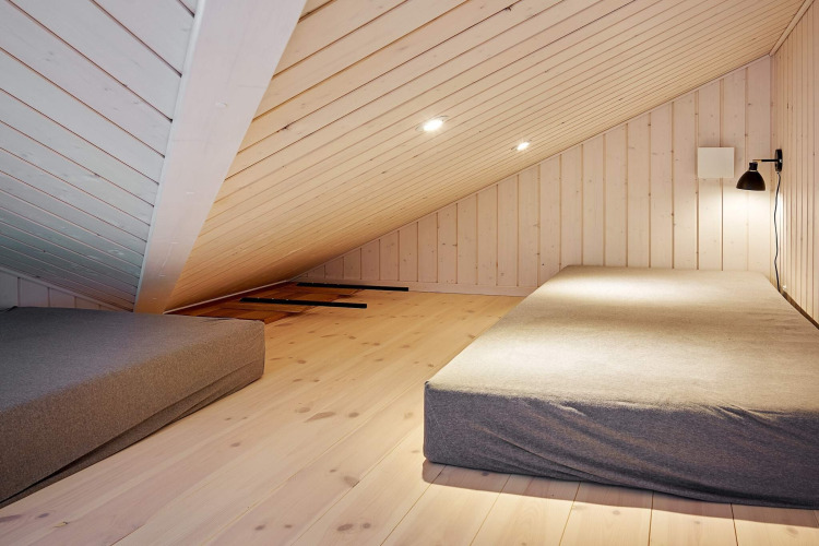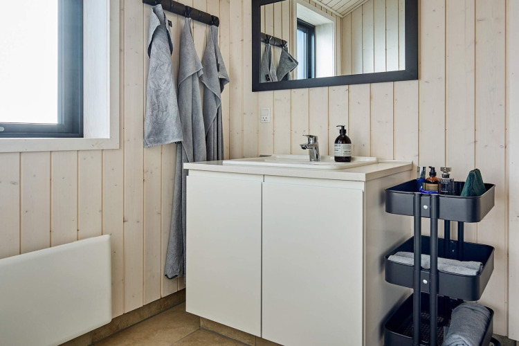 Das Haus verfügt über drei komfortable Schlafzimmer mit viel Tageslicht sowie einen großen Dachboden über einem der Zimmer, der als zusätzlicher Schlaf- oder Rückzugsbereich dient. Es gibt zwei Badezimmer, beide mit Fußbodenheizung – eines davon mit Dusche – sodass es morgens kein Anstehen gibt und die Füße nach dem Duschen immer warm bleiben.